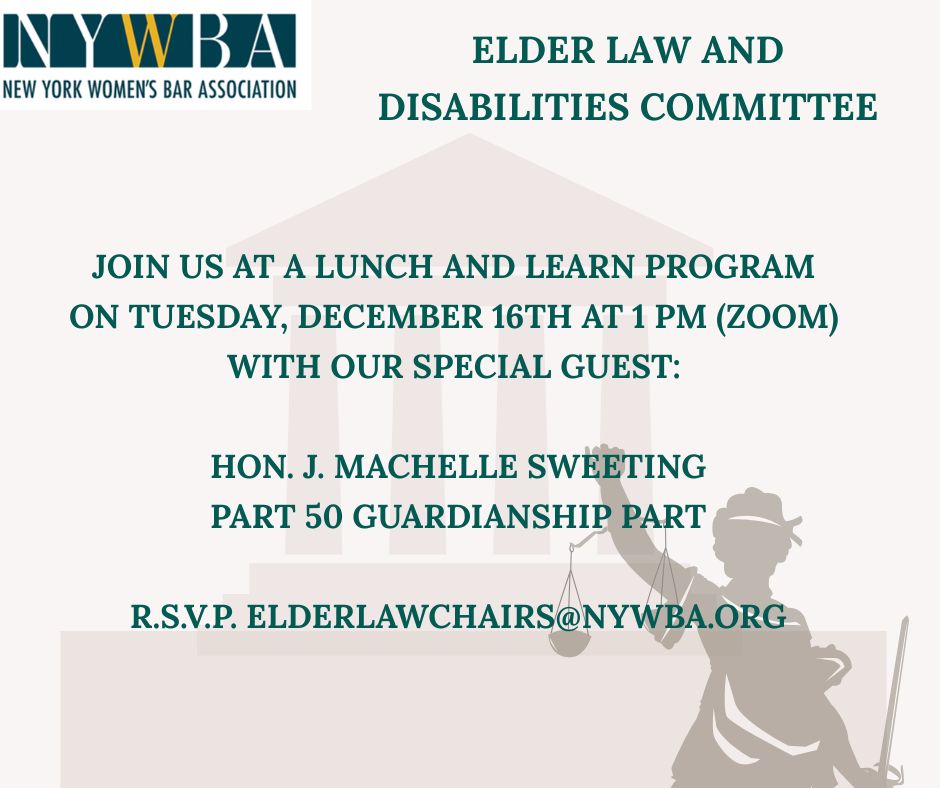 Judge Sweeting is a Guardianship Judge in New York County. Questions? Contact elderlawchairs@nywba.org